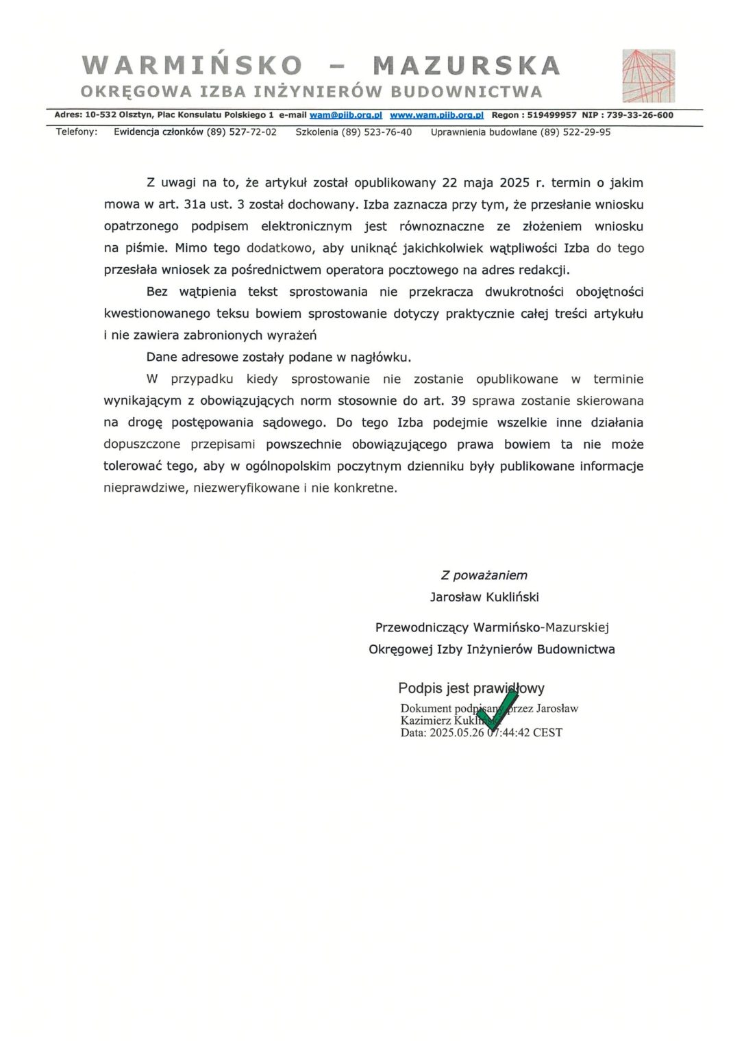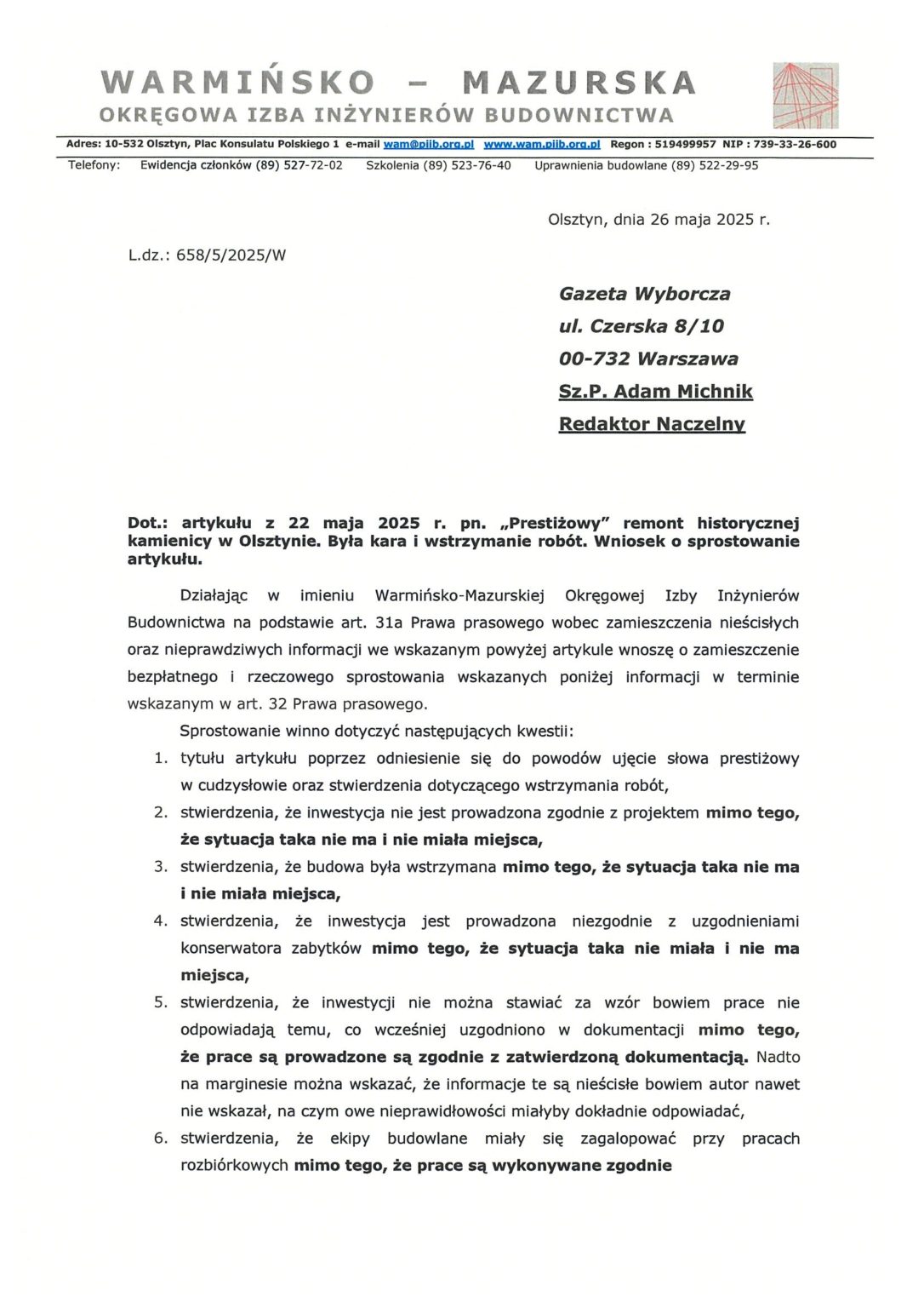 W związku z ostatnią publikacją prasową zamieszczoną na łamach olsztyńskiego wydania Gazety Wyborczej informujemy, że Warmińsko – Mazurska Okręgowa Izba Inżynierów Budownictwa wystąpiła na drogę prawną.  Liczymy na szybką reakcję osób zaangażowanych w powstanie tego materiału na łamach Gazety Wyborczej.